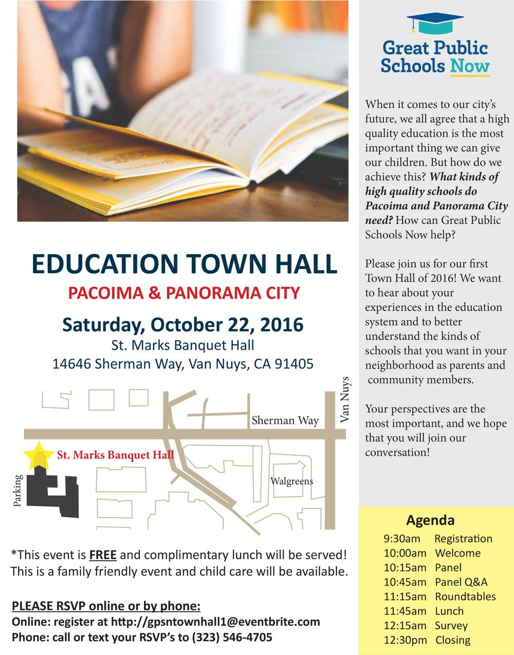Parents and families are invited to an upcoming education town hall October 22, 2016. This town hall will be an opportunity for the non-profit Great Public Schools Now to learn from each other and talk about the educational needs unique to our neighborhood.