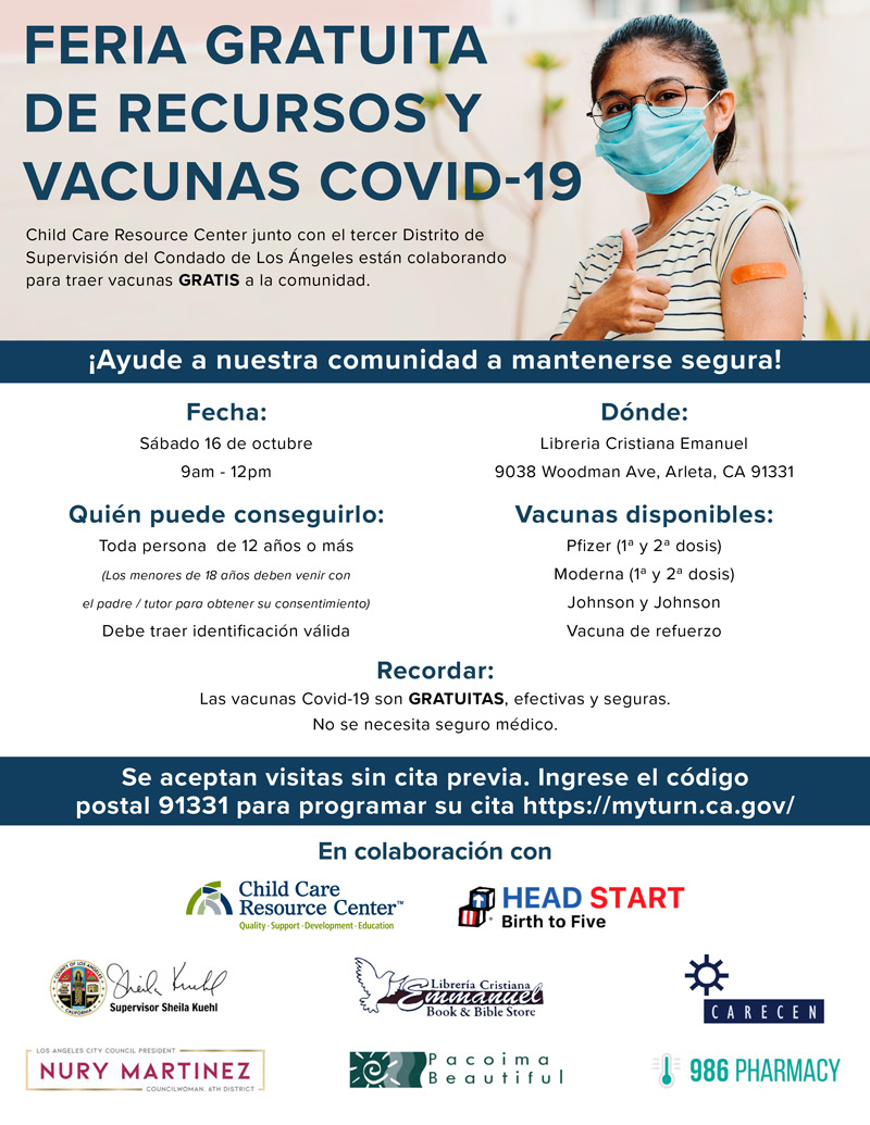 Child Care Resource Center junto con el tercer Distrito de Supervisión del Condado de Los Ángeles están colaborando para traer vacunas GRATIS a la comunidad.